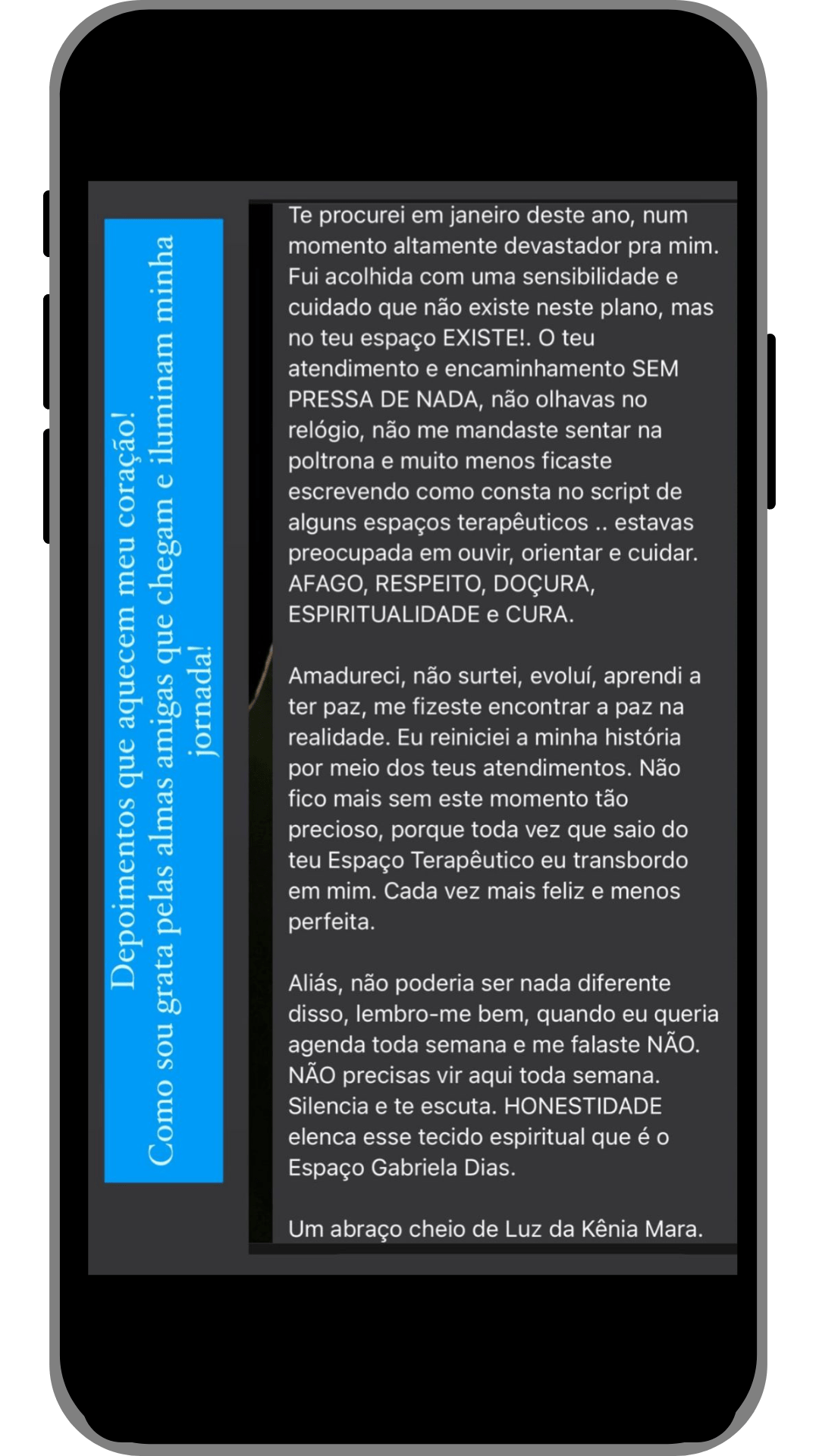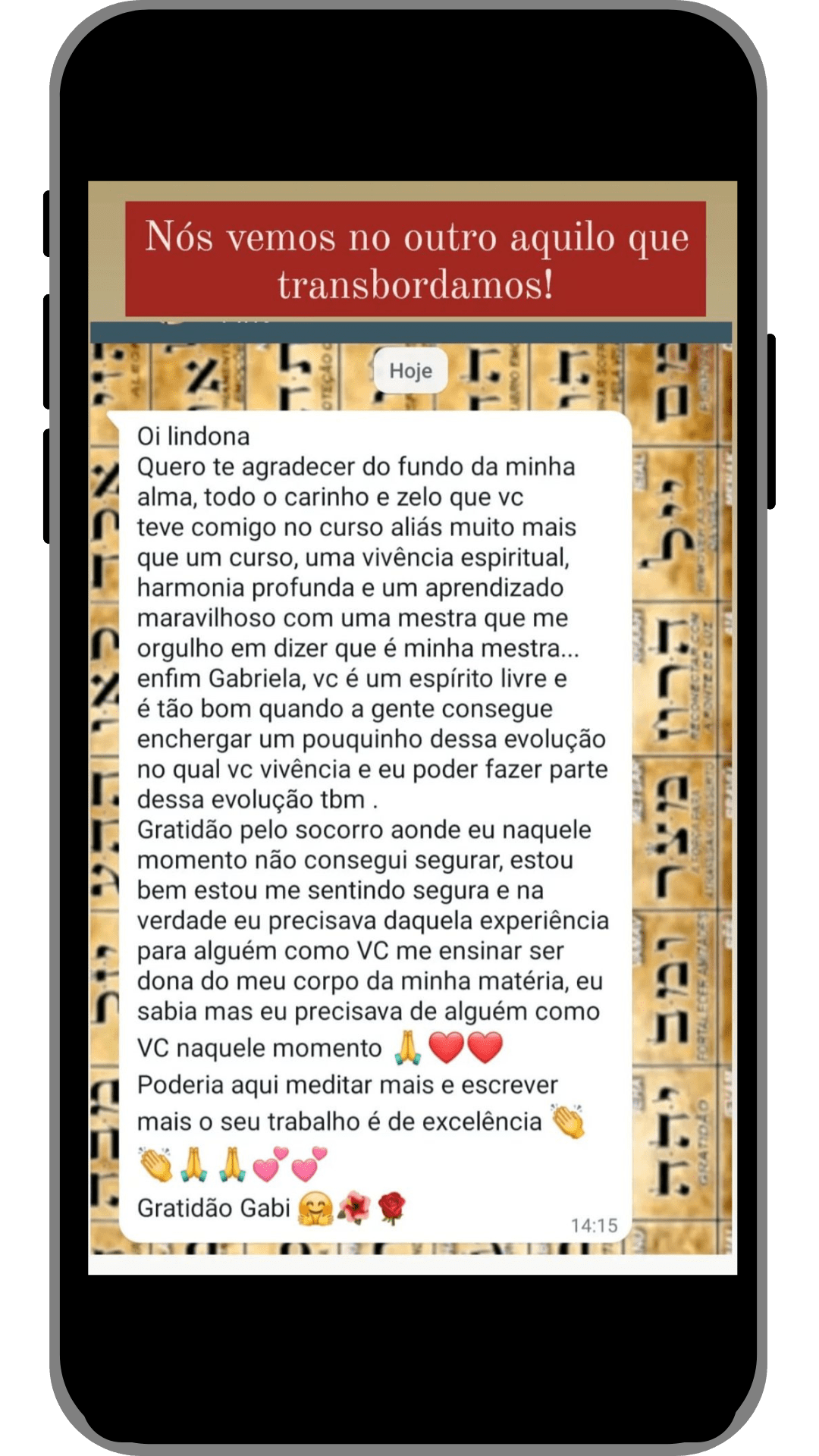 Cada jornada vivida no Instituto Gabriela Dias® deixa marcas de transformação e recomeço. Quem passa por aqui experimenta não só técnicas e aprendizados, mas uma mudança profunda na forma de se enxergar e de se relacionar com a vida. Já foram mais de 6 mil vidas transformadas, pessoas que sentiram um novo sentido de presença e consciência em suas vidas. Como é o caso da Marijoice e da Ana Paula – clique nos vídeos e ouça o que elas tem a dizer: